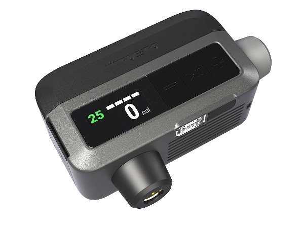September 28, 2025 - The Trek Air Rush is a lightweight, compact electric pump that fits in a jersey pocket or saddle bag for inflation on the go. Its bright digital LED display shows target pressure, current pressure, battery charge, and pressure units, while three simple buttons make operation easy. From flat, Air Rush easily inflates two 29×2.4′′ tires to 40psi or two 700x28mm tires to 90psi. There’s even a light so you can find your valve stem in low-light conditions. It takes only an hour to fully charge via USB-C, and it comes with nozzles for Presta and Schrader valves as well as a hose for tight fits. The SRP is $134.99.