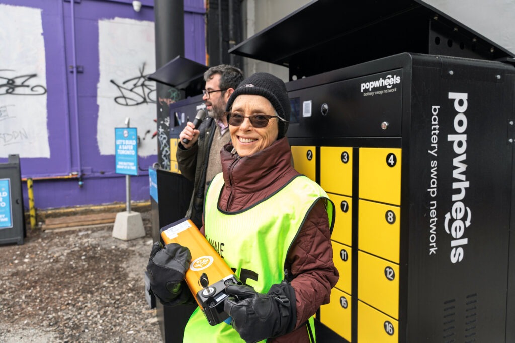 Councillor Dianne Saxe, University–Rosedale (Ward 11) honoured with first battery swap at the new Toronto downtown hub. © PopWheels/Alfredo Alves
