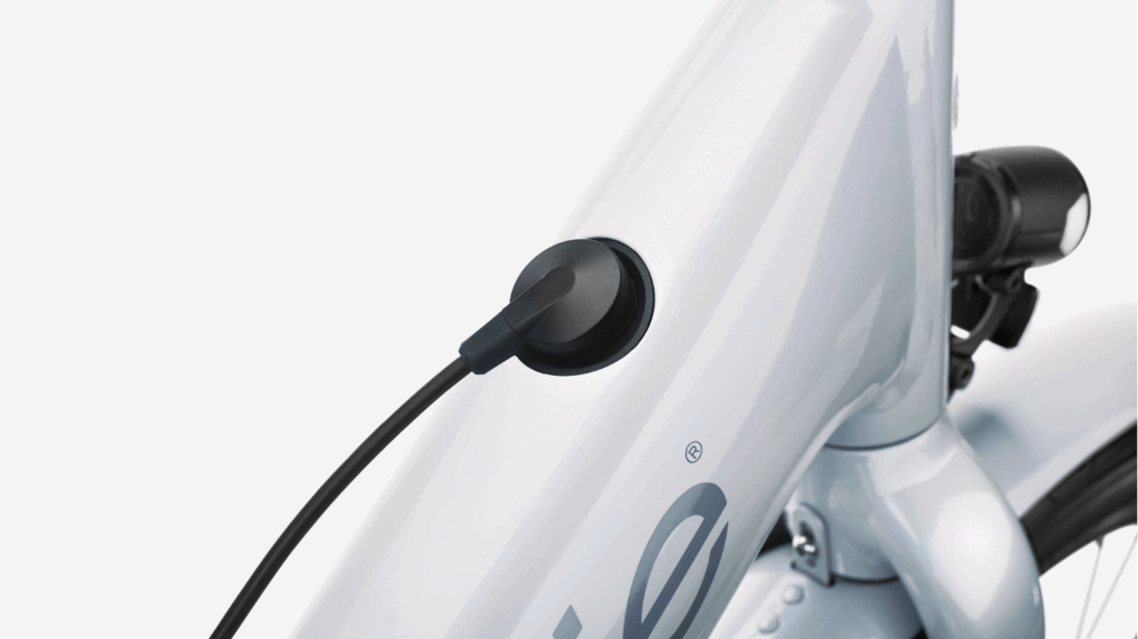 The EasyMag charger connects to the bike’s port via a magnetic contact, and the wall-mountable base has a lighted display to show the charge level. A full charge is completed in 5.5 hours.
