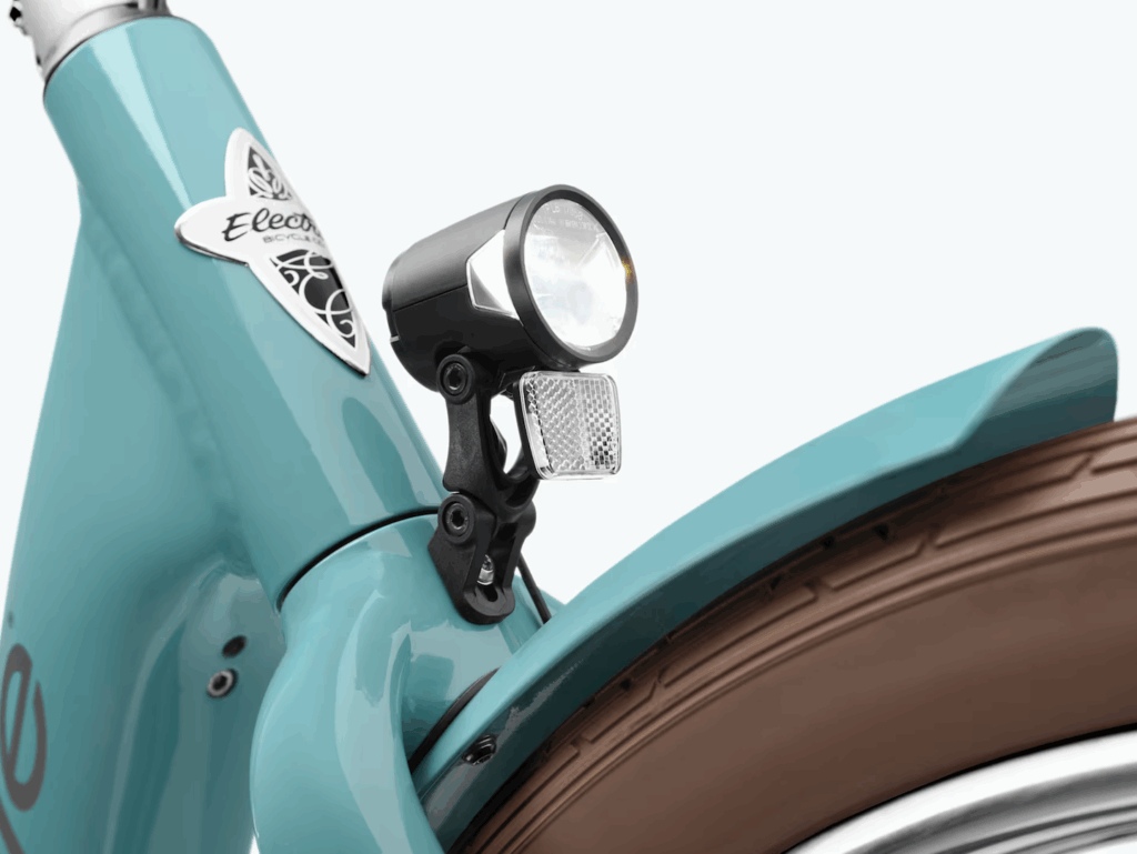 A Herrmans’ MR8 LED headlight delivers 180 lumens of illumination, and the Sate-Lite M-15 taillight offers both an automatic brake light and user-controlled turn signals for safe communication with other road users. Plus, the lights will stay on for up to three hours after the battery is drained.